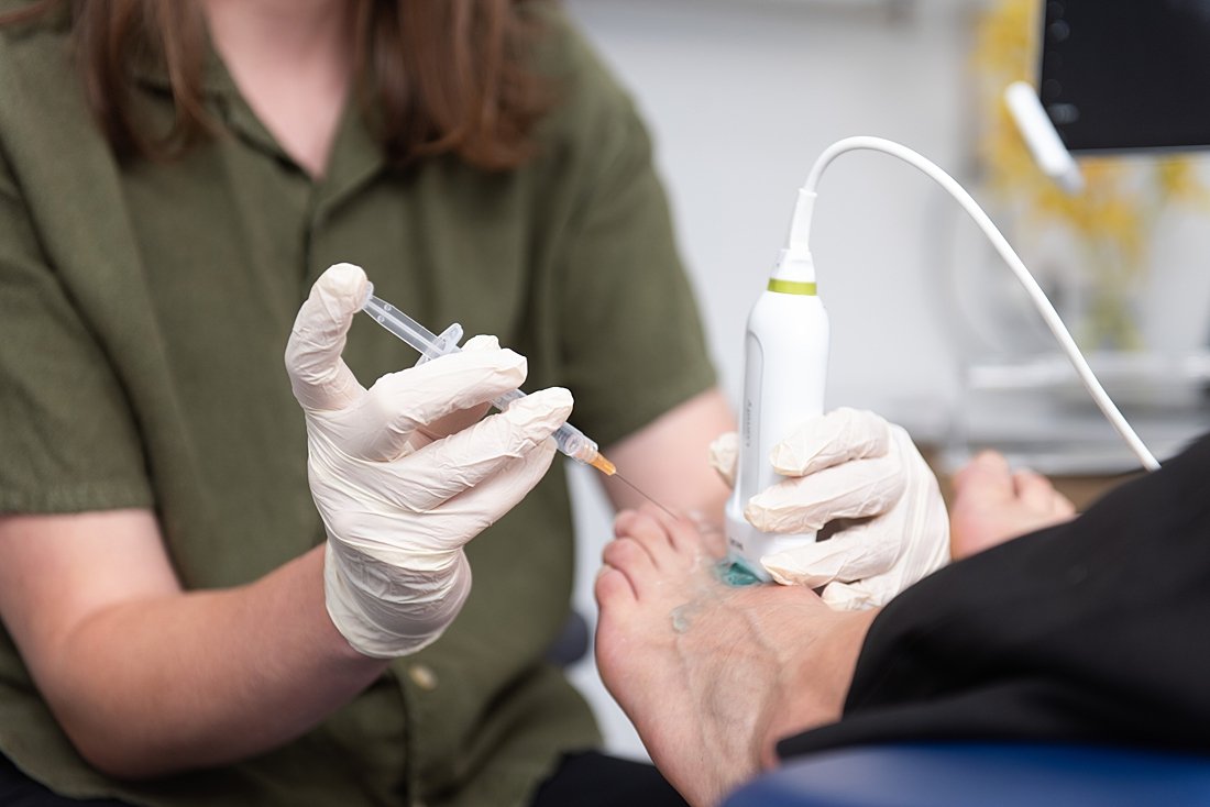 Cortisone Injections: Cortisone injections can aid in the healing and reduction of inflamed tissue. At Highett Podiatry, our endorsed podiatrist is trained and qualified to administer Cortisone for your injury. Your endorsed podiatrist can perform these injections guided by live ultrasound imaging to help you get the best results. At Highett Podiatry, we are fortunate to have an onsight handheld ultrasound machine.